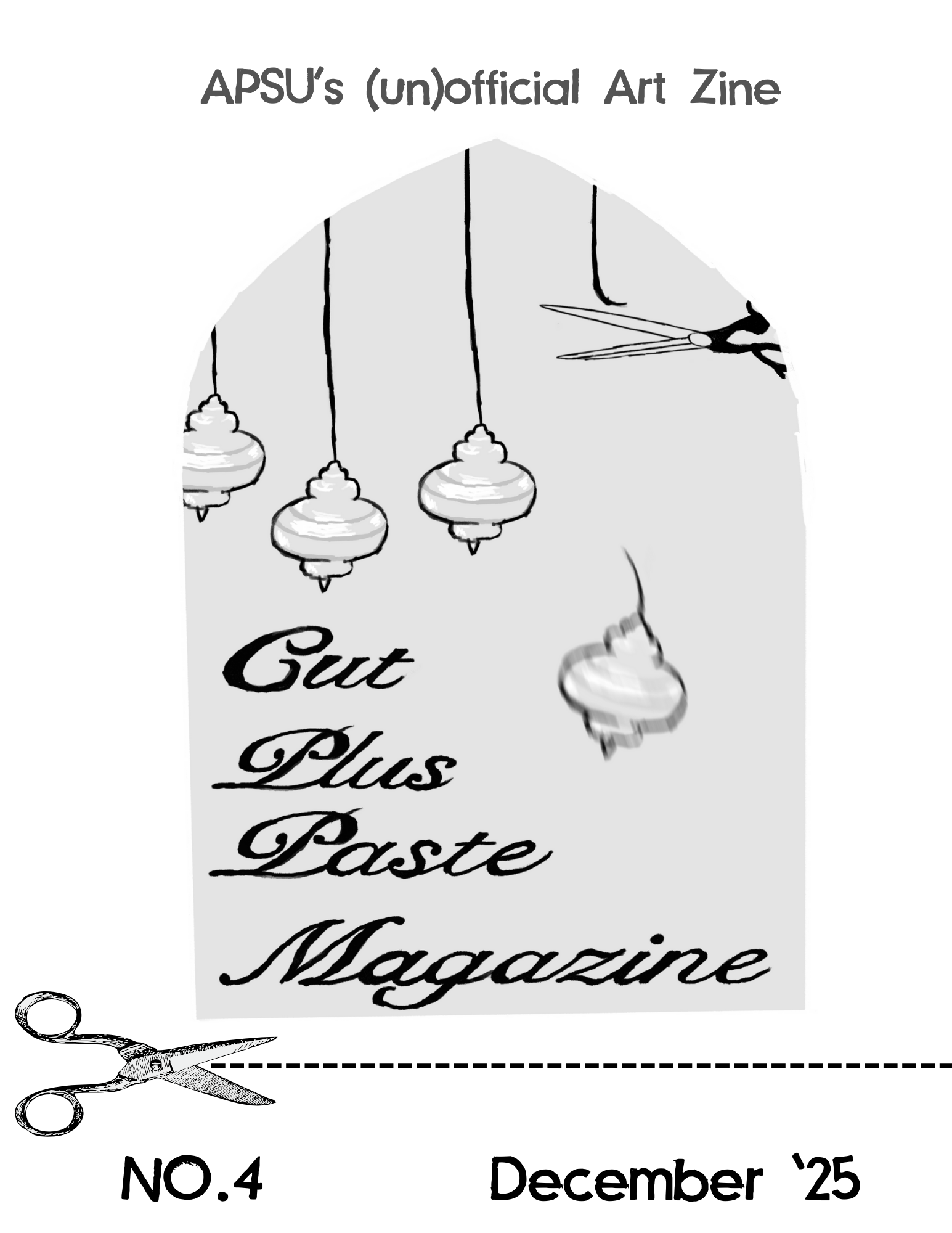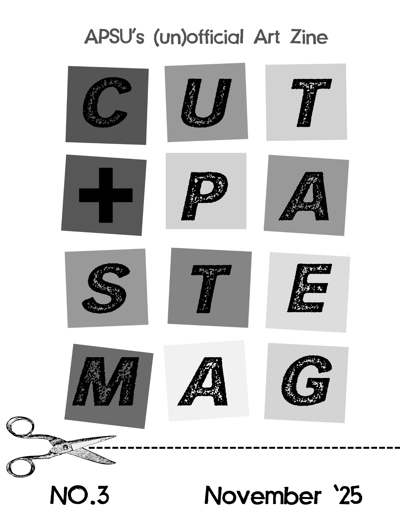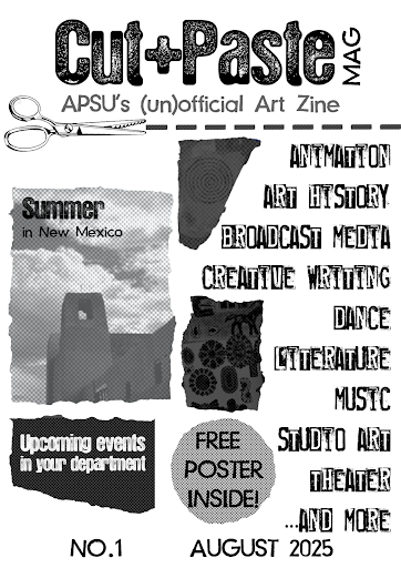 I began working on this magazine in August of 2025, when my friend Meadow Jozwiack asked me if I’d like to help her with a magazine project. We drafted up a bunch of different names, but Cut + Paste, referencing the Art+Design department’s plus motif, stuck almost immediately. My dad’s magazine, Ville: A Rock and Roll Magazine, was a huge inspiration as well. The goal of our magazine is to feature the art and writing of APSU students, keep people up-to-date on happenings, and to keep the magazine DIY so that we could use it for activism as well.